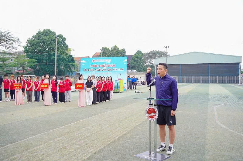 TS Bùi Kiên Cường - Phó Bí thư Đảng ủy, Phó Hiệu trưởng, Chủ tịch Công đoàn Trường, Trưởng Ban Tổ chức phát biểu khai mạc Giải thể thao